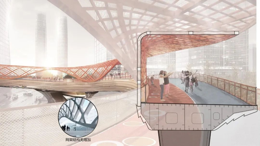 如今呈現在我們眼前的交子之環,其總體形態來自交子紙幣上的銅錢紋路,紋路線條經過柔和與投影處理,呈現出多層次的飄逸曲線。大橋以複雜的多曲面結構實現鋼材質的視覺「紙質化」,達到一種柔美的視覺效果,使每一條曲線都是數學之美的展示,這樣的設計難度具有相當的挑戰性。