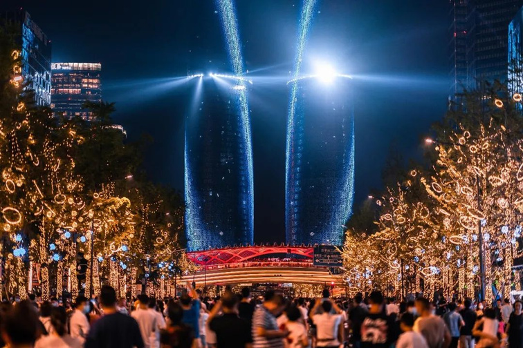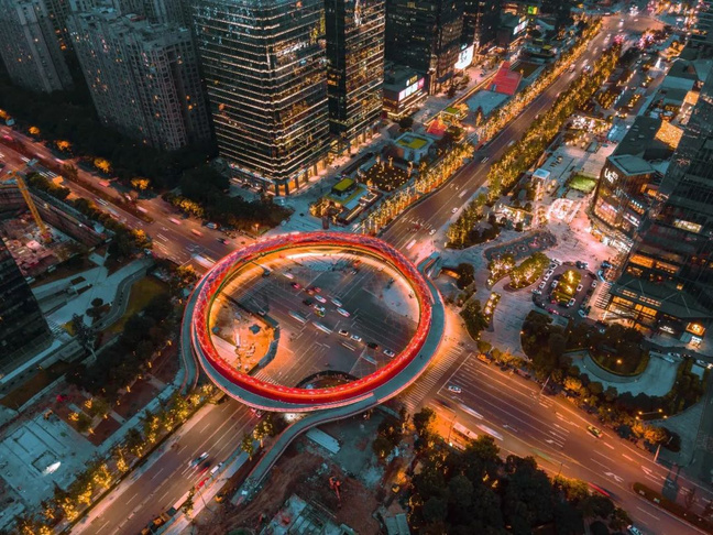 2021年8月20日成都高新區「交子之環」亮相,它的一身「年輕」不僅止於年歲,還因它由一支「『老成都』帶領的『新成都』人組成設計團隊」。它一圈橙紅,顯得活力,即使夜來仍以燈火串連一帶道路星爍,拔高的天府國際金融中心雙子塔,亦以天來光影共同測繪城市呼吸的脈動。「多場景」空間結構,使「交子之環」經常可見藝術演出,街道兩側流光轉影,給金融區疊加科幻。